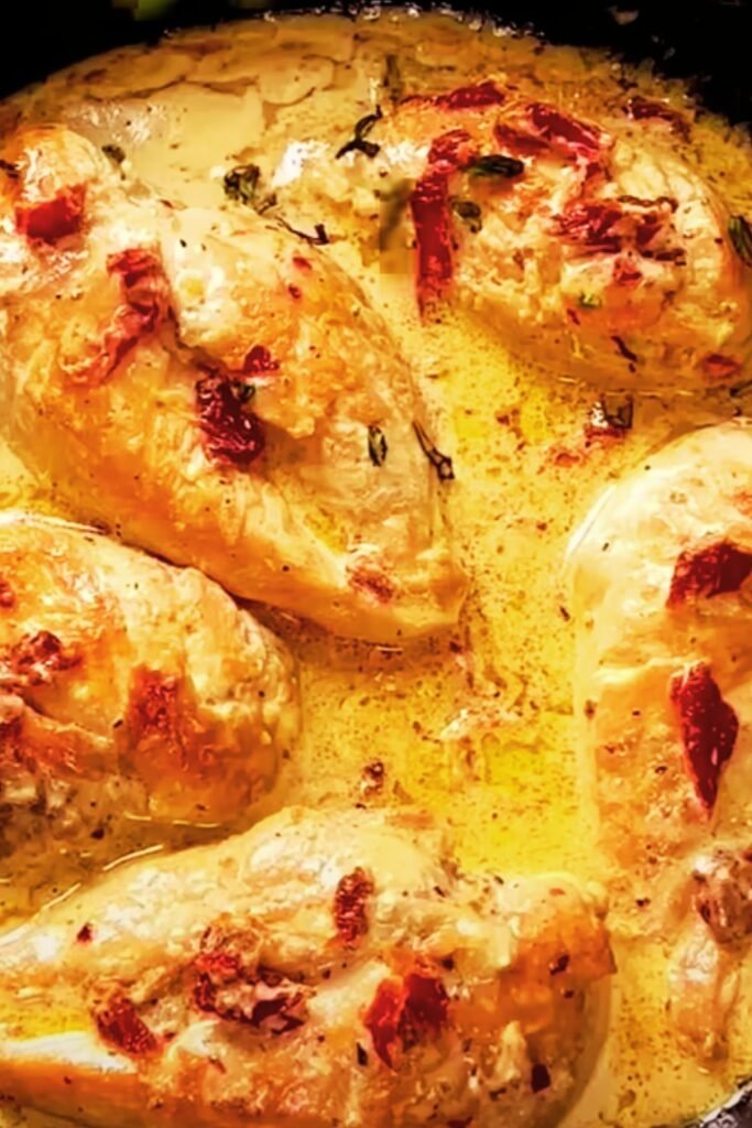 Step 8: Slow Cook to Perfection Cover the pan and reduce heat to low. Let everything simmer gently for 25-30 minutes, or until the chicken reaches an internal temperature of 165°F (74°C). The sauce will thicken slightly and the flavors will meld beautifully.